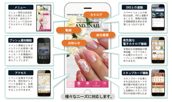 簡単アプリ作成CMS機能、予約機能、電子カタログ機能、スタンプ機能、ポイント機能、クーポン機能、多店舗機能、アンケート機能、友達紹介機能、HTML編集機能、メニュー設定機能、アプリダウンロード分析機能、プッシュ通知分析機能、6種類のプッシュ通知機能、地図案内機能、 App store Google Playストア登録機能、ハイブリッドアプリ機能、ウェブビュー機能、セグメントプッシュ、自動プッシュ、GPSプッシュ、予約プッシュなど多様なネイティブアプリ機能・マルチプラットフォーム機能を標準搭載してます。